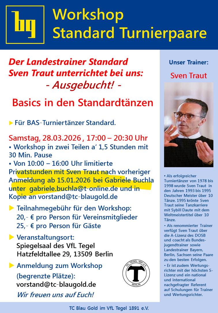 Wir freuen uns schon auf folgende Workshops und danken im Namen aller teilnehmenden Paare nochmals unseren Trainern Andrea Stachetzki und Dennis Kukuk, die uns wie immer professionell und humorvoll durch den Workshop geleitet haben.